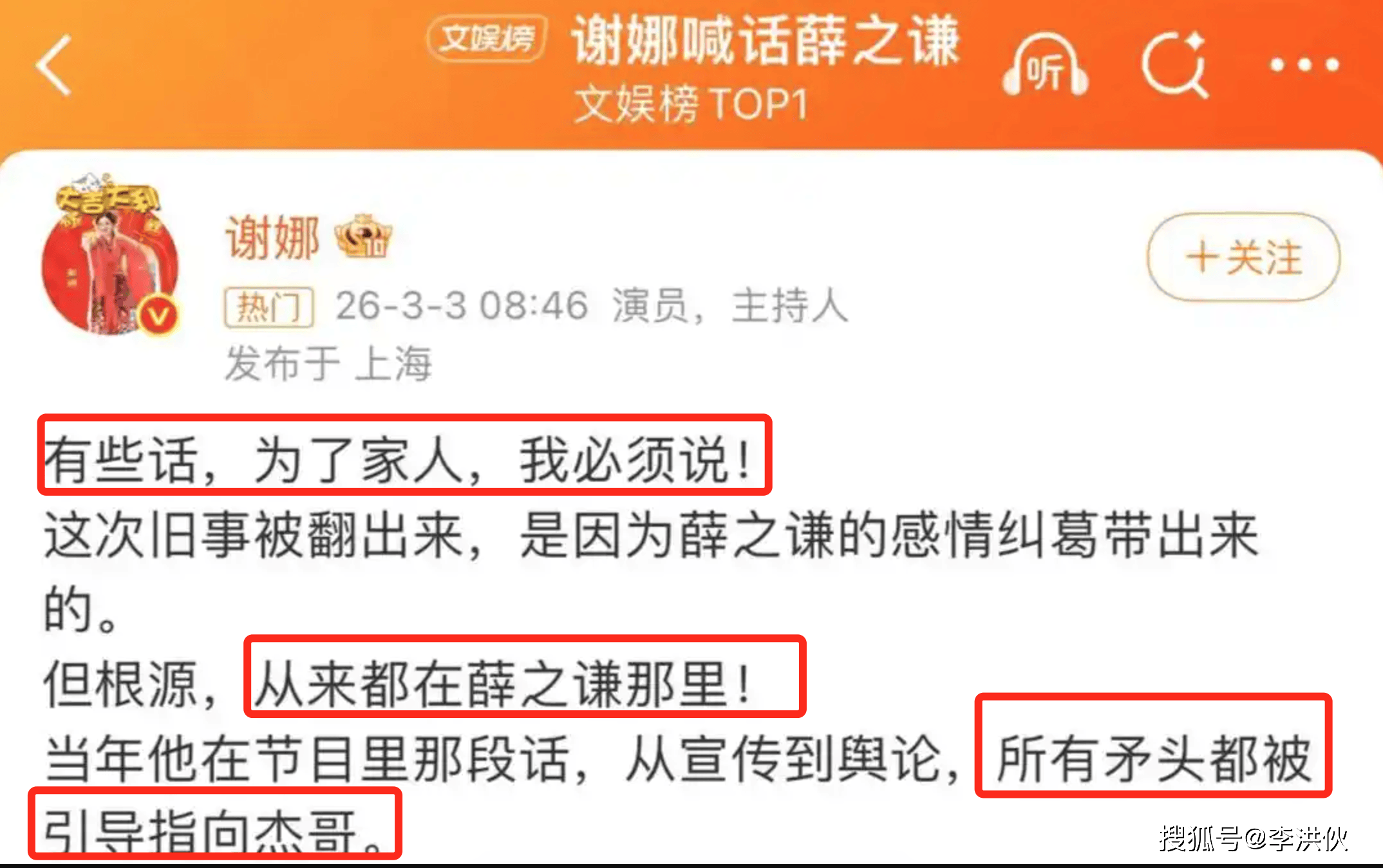 于是,她在微博上细数丈夫张杰如何凭借个人努力和实力一步步走到今天之余,也对把张杰无辜卷入这起事件的“罪魁祸首”薛之谦毫不留情面:如果当初不是你为了吃红利在节目上口不择言,也不会让张杰陷入这些无端的质疑中!强烈要求薛之谦对张杰道歉!