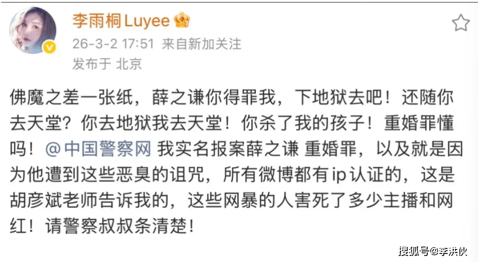 3月2日,李雨桐在微博再次发文痛斥薛之谦和她曾经的感情纠葛,包括“重婚罪”、“打胎”等各种指控,将薛之谦和妻子高磊鑫又双双推上风口浪尖。