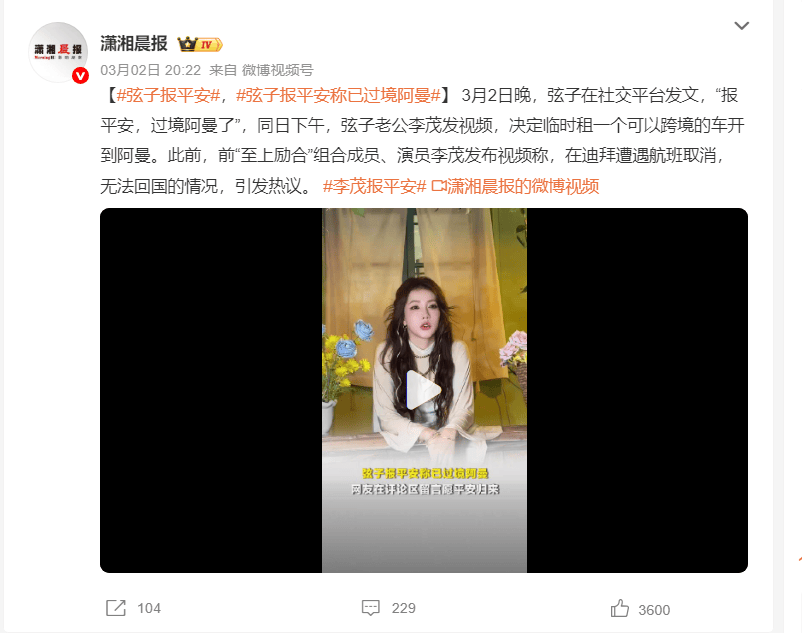 3月2日晚,弦子在社交平台发文,“报平安,过境阿曼了”,同日下午,弦子老公李茂发视频,决定临时租一个可以跨境的车开到阿曼。此前,前“至上励合”组合成员、演员李茂发布视频称,在迪拜遭遇航班取消,无法回国的情况,引发热议。