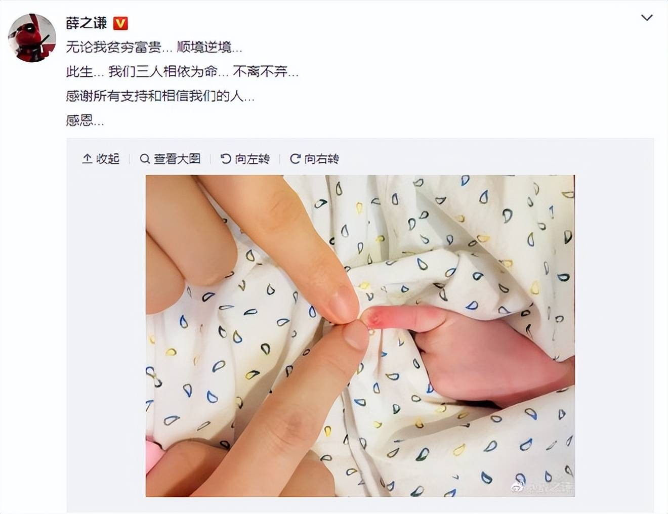 2018年9月6日,薛之谦晒出一家三口手指照宣布当爸。照片中刚出生的小宝宝伸出食指,一家三口的食指触碰在一起,呼应了薛之谦“相依为命、不离不弃”这八个字。