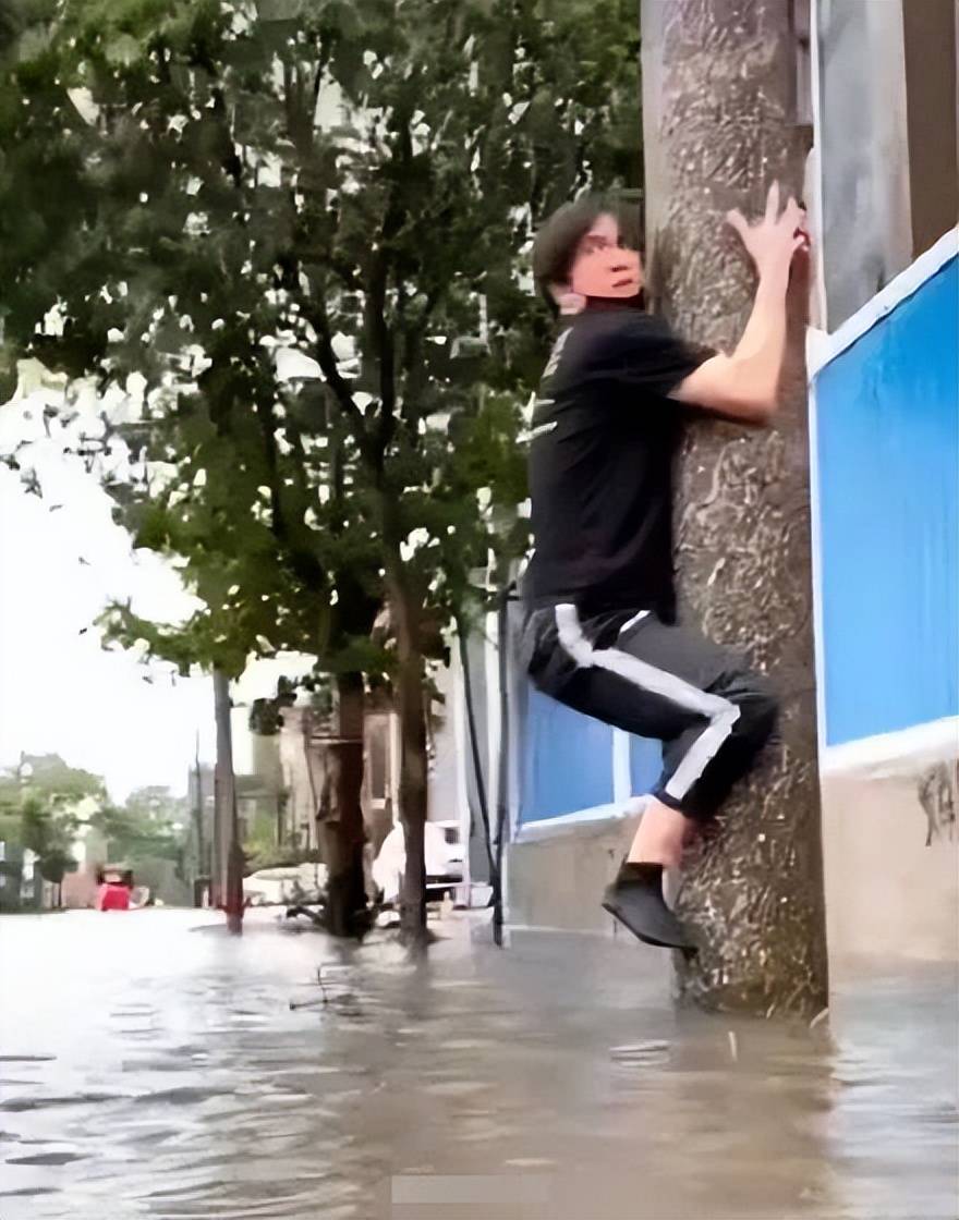 结果到了薛之谦这画风突变。他上传一段视频,配文“通告途中”,视频内容为薛之谦抱着电线杆四处张望,地面满是积水,一脸茫然无助。