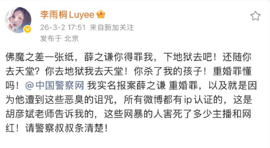 沉寂许久的李雨桐再次发难,开始通过互联网持续曝光薛之谦,并指控薛之谦犯重婚罪,艾特有关部门。以往李雨桐的爆料不过是感情纠葛,不会给薛之谦带来实质影响,但这次不同。正常来