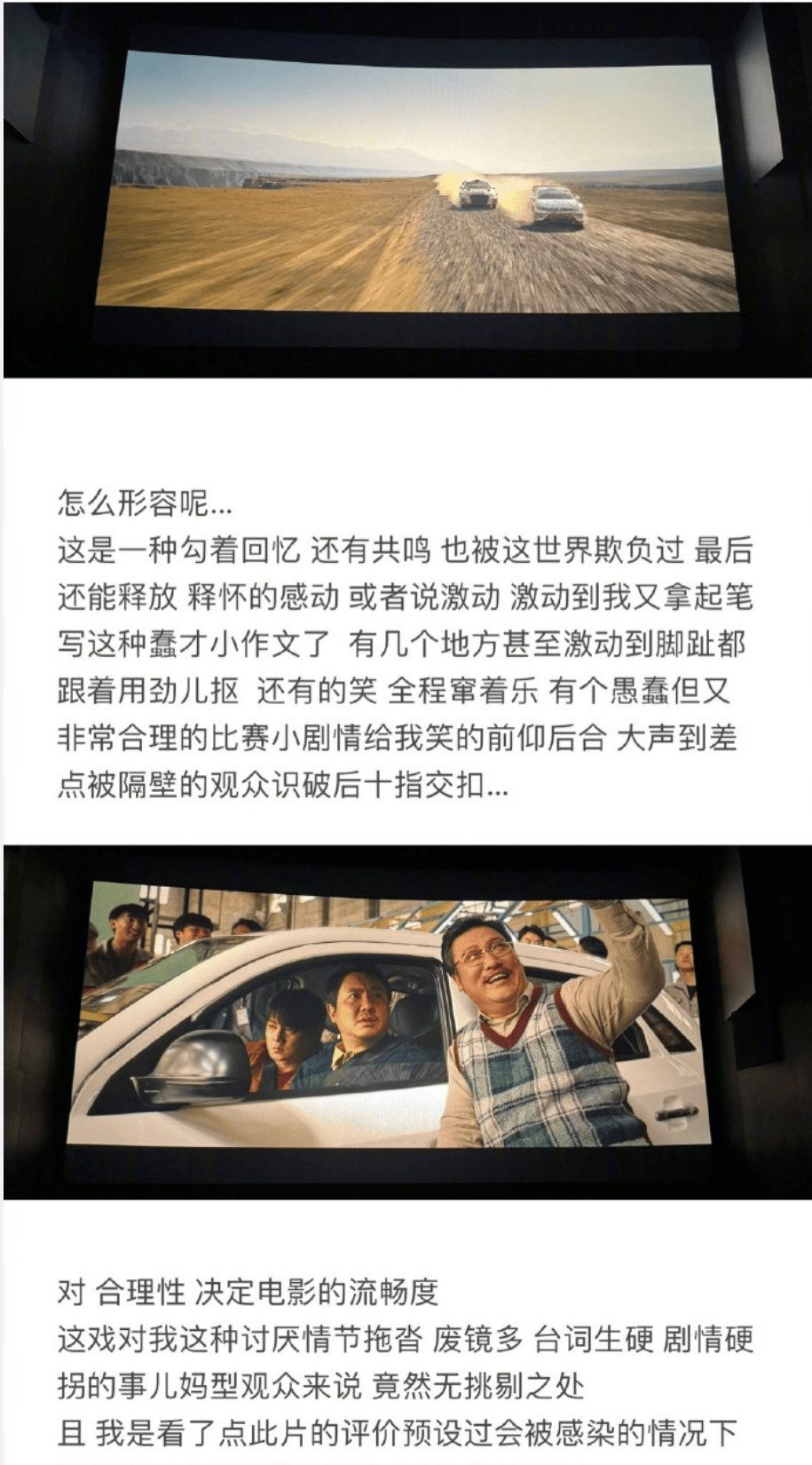 2024年春节档《飞驰人生2》上映,薛之谦写小作文给电影打call。这本事好事儿,但他在观影过程中不但屏摄,还插到了自己的影评里。他用了三张屏摄照片,第一张是电影后半段赛车段落中,两辆车在黄沙中追逐。第二张是影片中贾冰和坐在车里的沈腾、尹正拍合影,第三张差不多暴露了电影的高潮部分,剧透了剧情,电影中范丞丞和沈腾先后跑完比赛,凭借总积分领先,拿到了理想的名次。