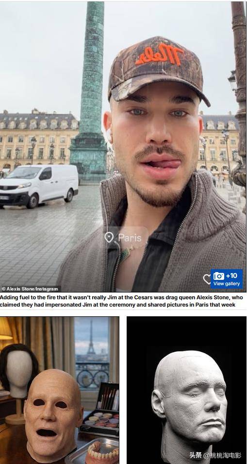英国知名变装艺术家亚历克西斯·斯通更是唯恐天下不乱,在社交平台上晒出带有凯瑞面孔的硅胶面具和假牙,暗示是自己李代桃僵出席了活动,连梅根·福克斯等明星都被这出恶作剧蒙在鼓里。