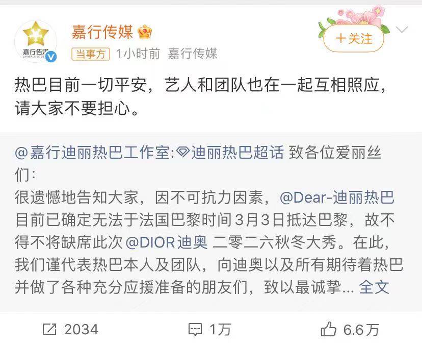 嘉行传媒也表示迪丽热巴目前一切平安,艺人和团队也在一起互相照应,请大家不要担心。