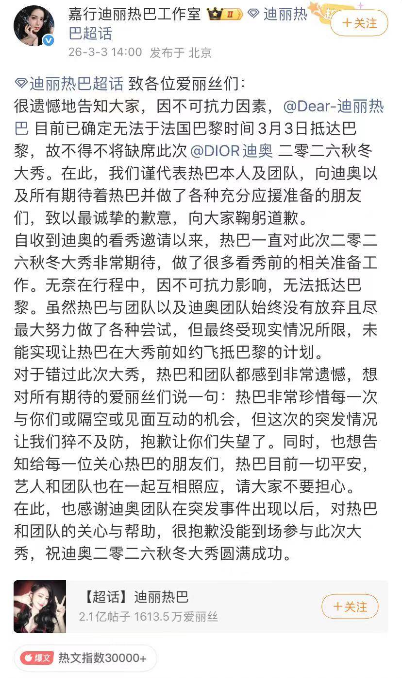 迪丽热巴计划前往巴黎看秀,估计在阿联酋无法转机前往巴黎,目前美以伊战争导致阿联酋机场受损,而且艺人李茂弦子夫妇都是转道阿曼才登机回国。迪丽热巴工作室发布道歉信,估计很