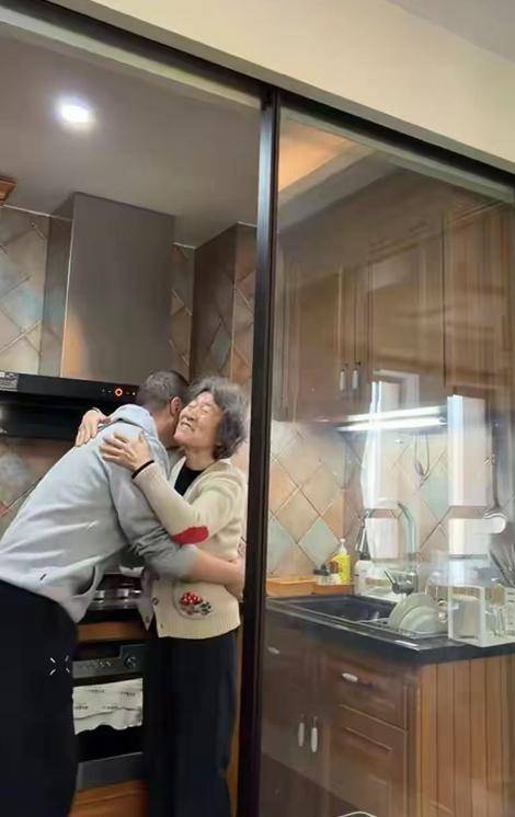 然后他找了个地方把手机固定住,趁妈妈在洗碗的时候,从背后走过去把人抱住了,就这么一个动作,他妈妈笑了,那个笑容真的很好看,不是那种刻意摆出来的笑,就是被儿子突然抱住的那种有点惊喜、又觉得这孩子真好的笑