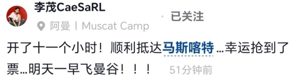 3月3日凌晨四点多,李茂发了动态说到了马斯喀特,但新的问题来了,原本3月4日东航从马斯喀特飞北京的航班又取消了,一路上他们一直在刷票,最后抢到了阿曼飞曼谷的机票,打算早上出发先去曼谷再想办法,马斯喀特是阿曼的首都,也是最大的城市,这个地方对他们来说只是一个中转点,能从这里飞出去就够了