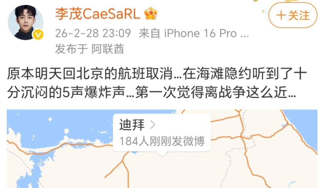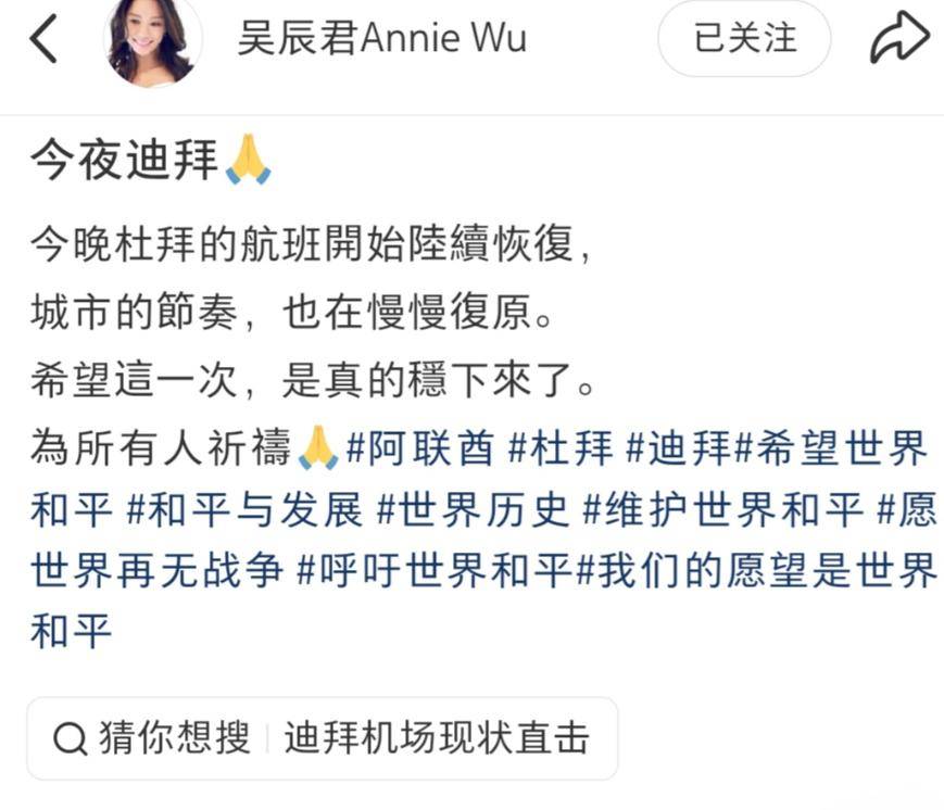 同样在阿联酋的女演员吴辰君也在这段时间分享了自己那边的情况,她说迪拜的航班已经开始陆续恢复,城市的节奏也在慢慢回来,她住在阿联酋好多年了,这次算是亲历了这一切,她说希望这次是真的稳下来了,为所有人祈祷