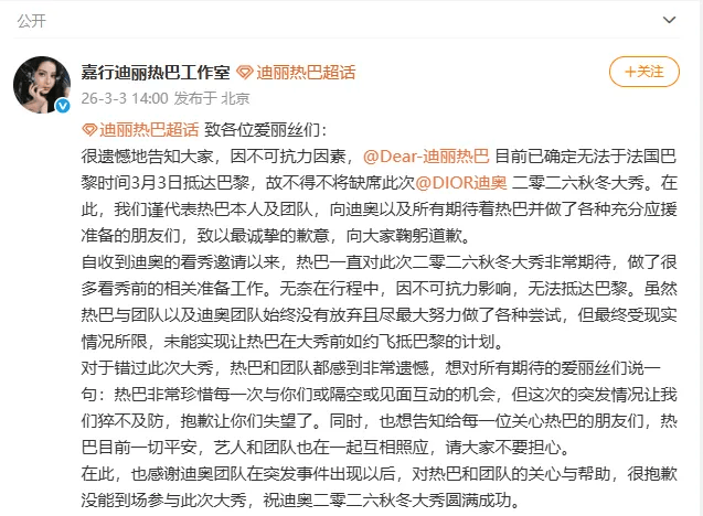 当迪丽热巴的团队选择迪拜作为中转站,奔赴那场万众期待的Dior二零二六秋冬大秀时,所有人都以为这将是她作为全球品牌大使的又一次高光时刻。然而,瞬息万变的中东局势打乱了所有计划,美以与伊朗的冲突升级,阿联酋领空关闭,迪拜机场陷入瘫痪,数十万旅客被困,热巴与团队也在其中。