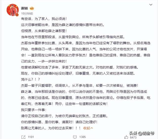 谢娜突然在社交账号发布长文,直指李雨桐爆料内容中提及的“薛之谦说张杰唱歌土” 一事,要求薛之谦公开道歉。