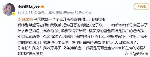 3月2日下午,李雨桐时隔多年再次在某博实名喊话薛之谦。