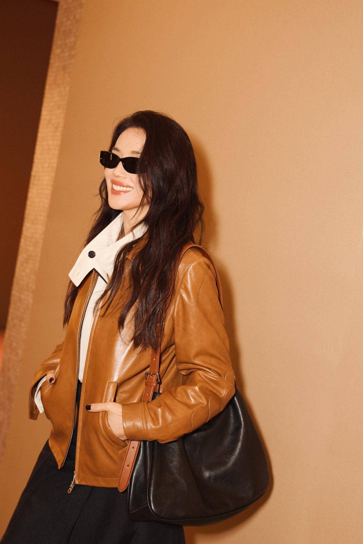 照片中50岁舒淇穿一件焦糖色皮外套配黑裙,妆容清透自然,头发随意披着,坐那儿跟旁边人说话,笑的时候眼睛弯弯的。