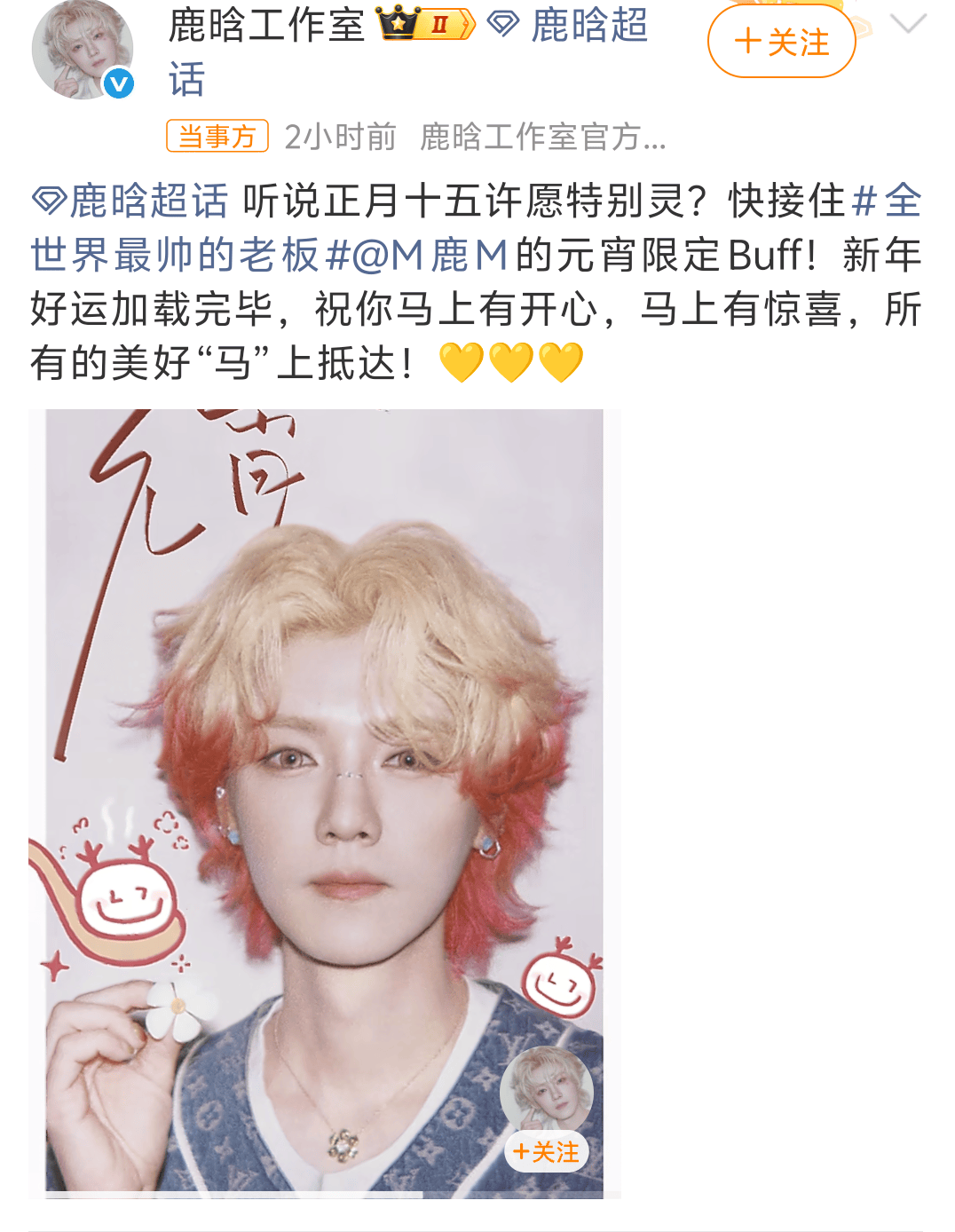再瞅瞅这配文,“所有的美好‘马’上抵达”,这脑洞开得,简直比宇宙还大!巧妙地把元宵许愿习俗和2026年马年生肖元素给融合到一块儿了。这哪是配文啊,这分明就是一颗“甜蜜炸弹”,直接把节日的吉祥寓意给“炸”出来了。有网友调侃:“鹿晗这是提前给马年打广告呢,还是想当马年的‘吉祥物’啊?”
