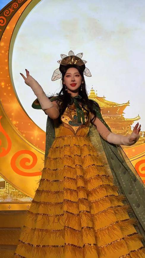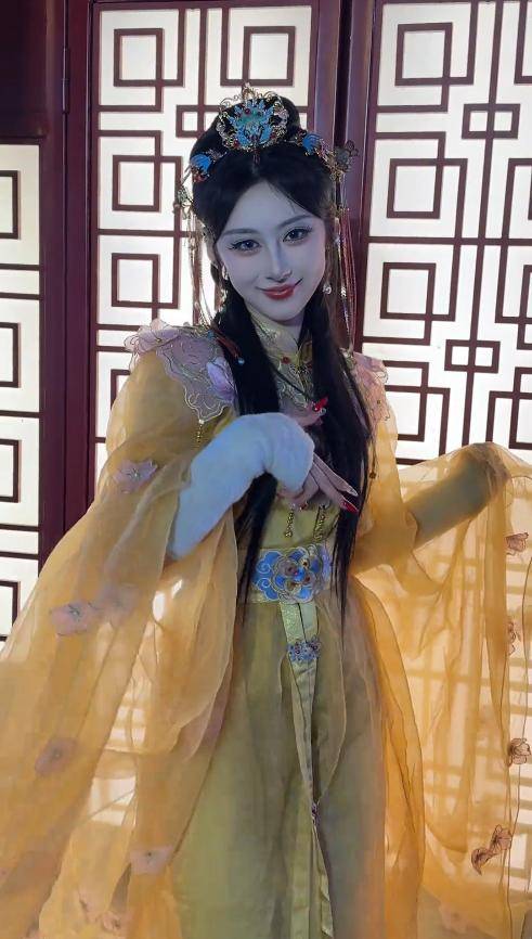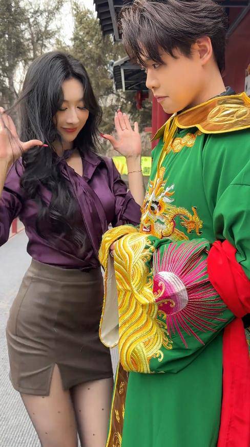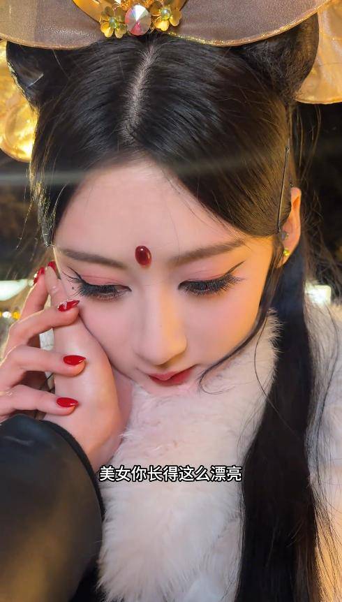 她的颜值也在线,妆容精致,眉眼间带着几分风情,和园区里的西游主题场景格外搭调。