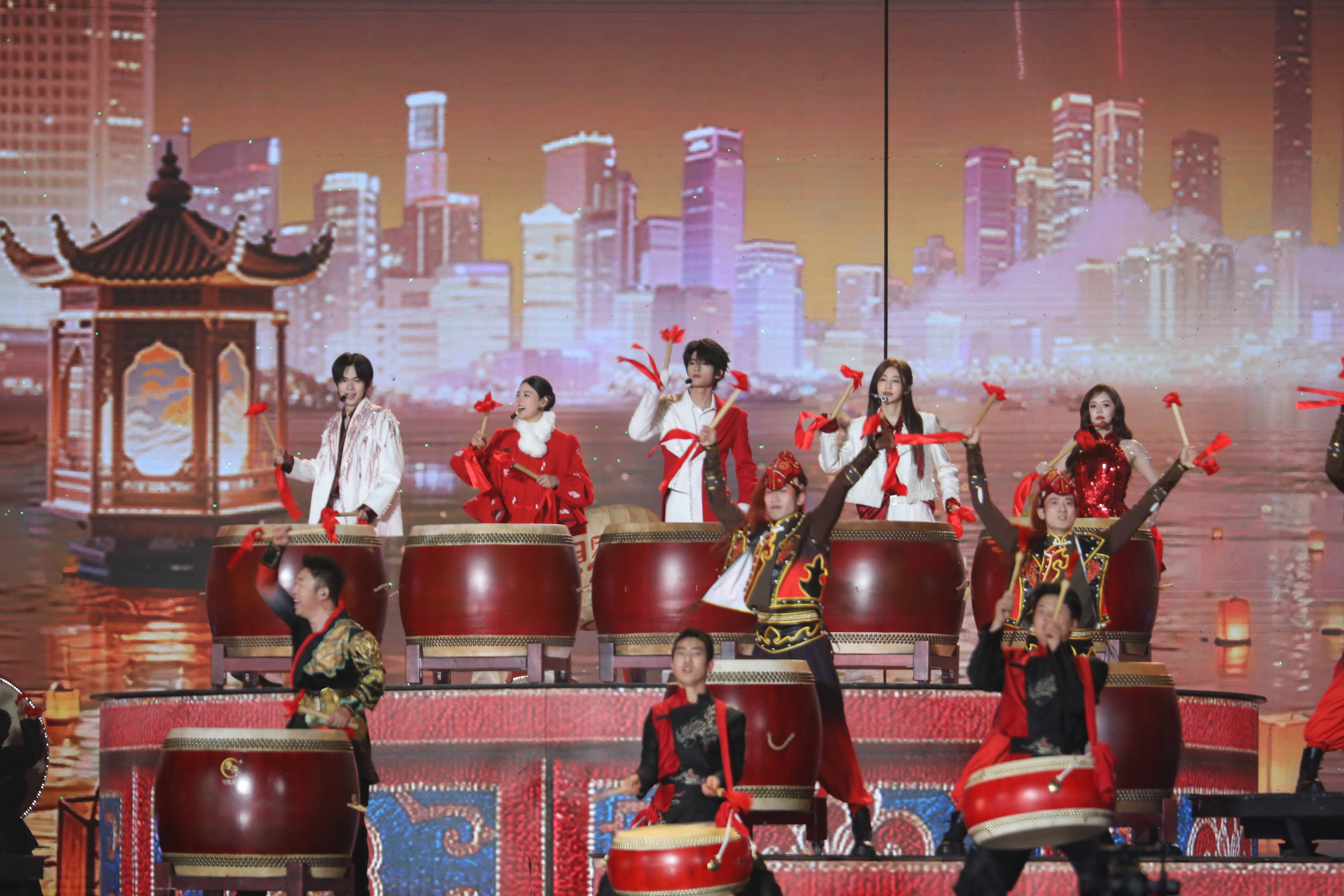 晚会由袁一琦、张峻豪、安崎等与国家级非遗传承人及28位锣鼓手共同带来的《威风锣鼓闹元宵》拉开序幕,气势磅礴。