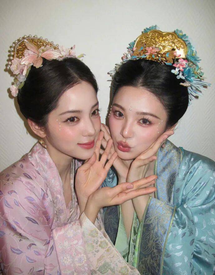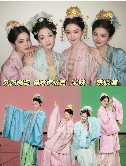 四位美女的古装造型,融合宋制汉服与现代流行乐,服饰采用藕粉、月白等淡雅色调,搭配珍珠花钿与仿生花卉发饰,凸显东方含蓄美学。