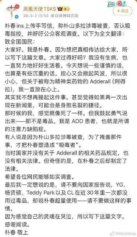 据韩媒报道,朴春于2026年3月3日亲笔撰文,指控朴山多拉为掩盖自身吸毒事实,将她塑造成了“吸毒者”。文中她情绪激动,坚称自己从未涉毒,所谓“吸毒”实为治疗注意力缺陷多动症(ADD/ADHD)而服用的合法处方药阿德拉(Adderall)。她更抛出一个关键质疑:当年韩国法律对阿德拉并无明文规定,相关禁令是在她的事件爆发后才仓促出台,这让她感觉自己成了“制度漏洞的牺牲品”。文末,她以“灵魂仿佛在哭泣”作结,公开呼吁公众与官方重启调查。