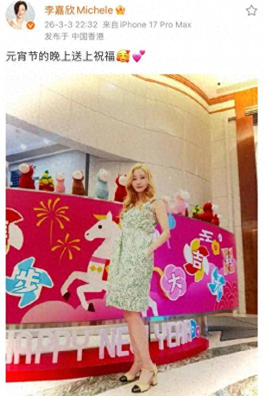 元宵节这天李嘉欣发了几张照片出来,金色卷发,绿色吊带裙,高跟鞋,背景还贴着春节的红色装饰,但整个人的打扮完全是夏天那套,放在一起其实有点违和,不过也挺好看的