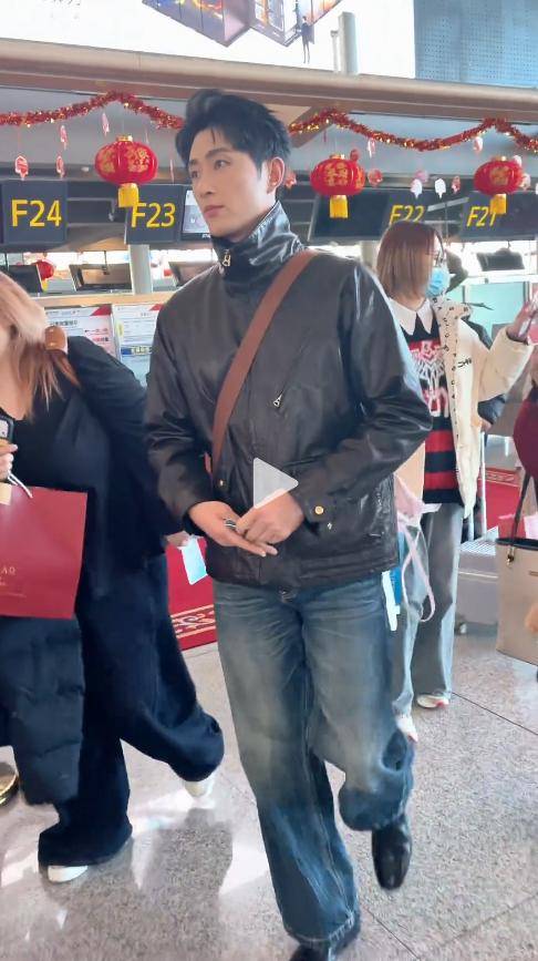 除了家乡偶遇,之前还有网友在机场碰到过他,素颜状态下的他,下颌线流畅锋利,黑色皮衣酷帅。