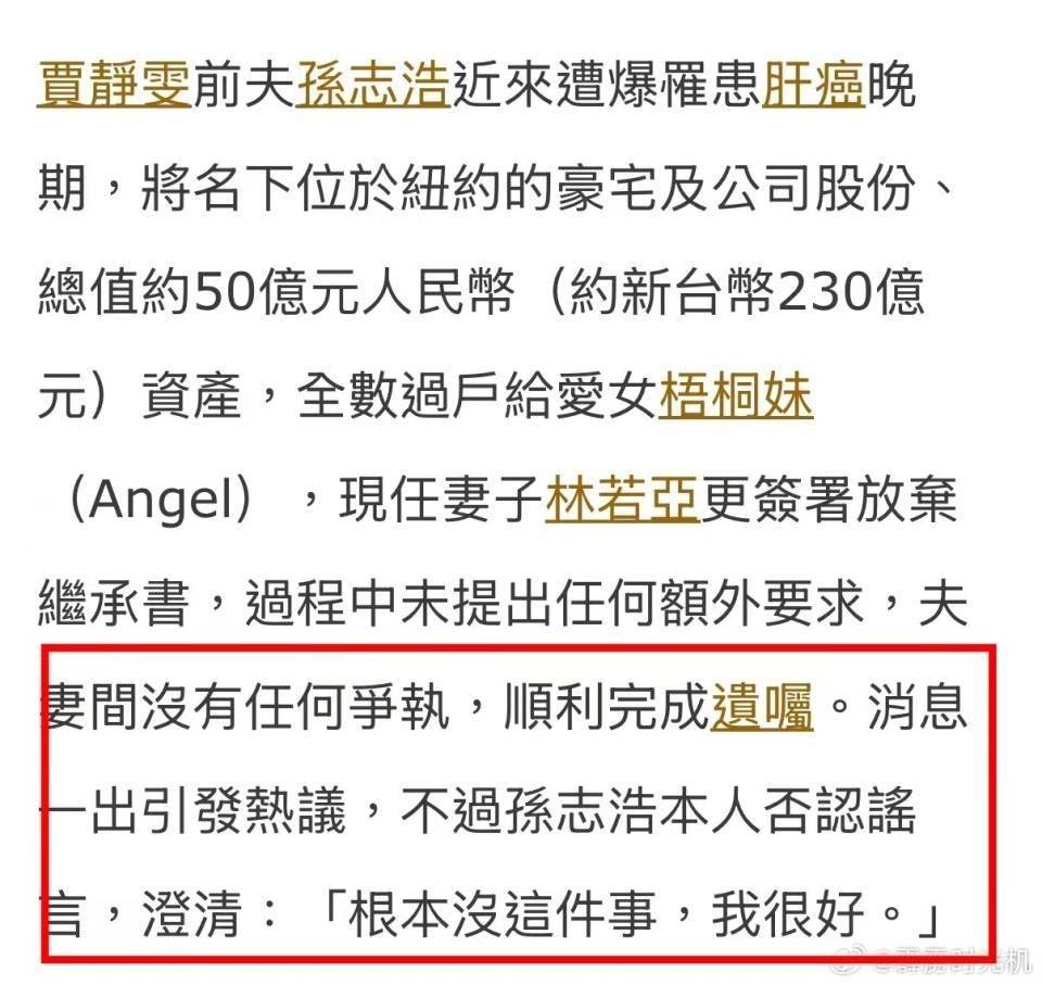 多方媒体报道证实贾静雯前夫孙志浩已进入肝癌晚期,并正在上海接受治疗。在此背景下,他将名下约50亿新台币(约合人民币11.5亿元)的资产全部过户给与贾静雯所生的女儿梧桐妹,现任妻子林若亚也签署了放弃继承权的声明,整个过程未起争端。
