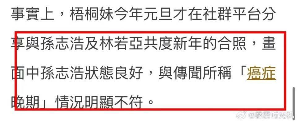 事实上,梧桐妹在2026年元旦在社交账号分享孙志浩和林若亚共度新年的合照,照片中的孙志浩状态良好,与传闻所称癌症晚期情况明显不符。