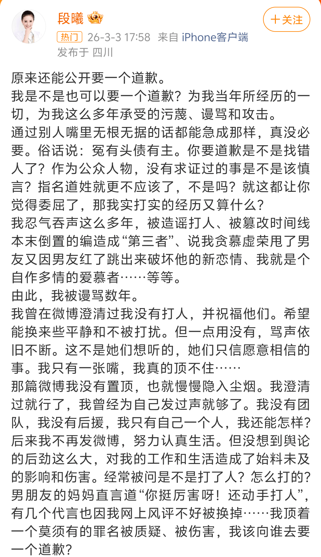 2026年3月的娱乐圈简直比连续剧还精彩!张杰前女友段曦突然甩出一篇“血泪控诉长文”,直接把张杰、谢娜、薛之谦甚至李雨桐都卷进了“四方混战”的瓜田里