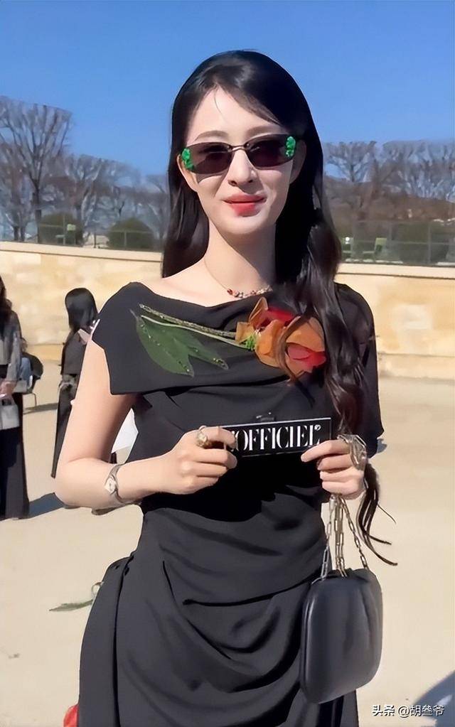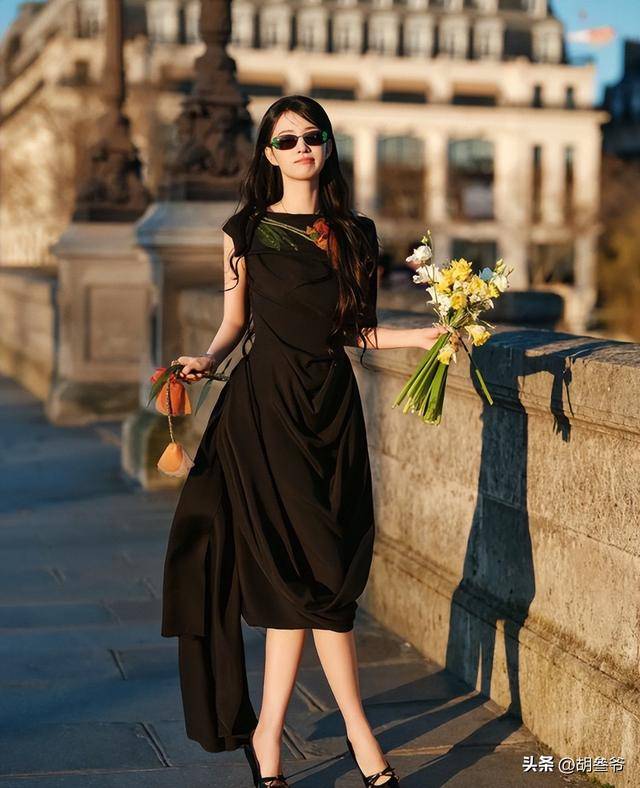 她穿着一身Dior2026早秋系列的黑色长裙,肩部的橙红立体花朵配绿叶刺绣精致到骨子里。
