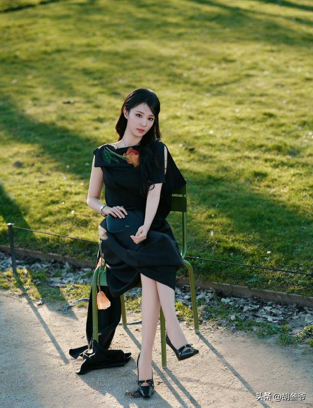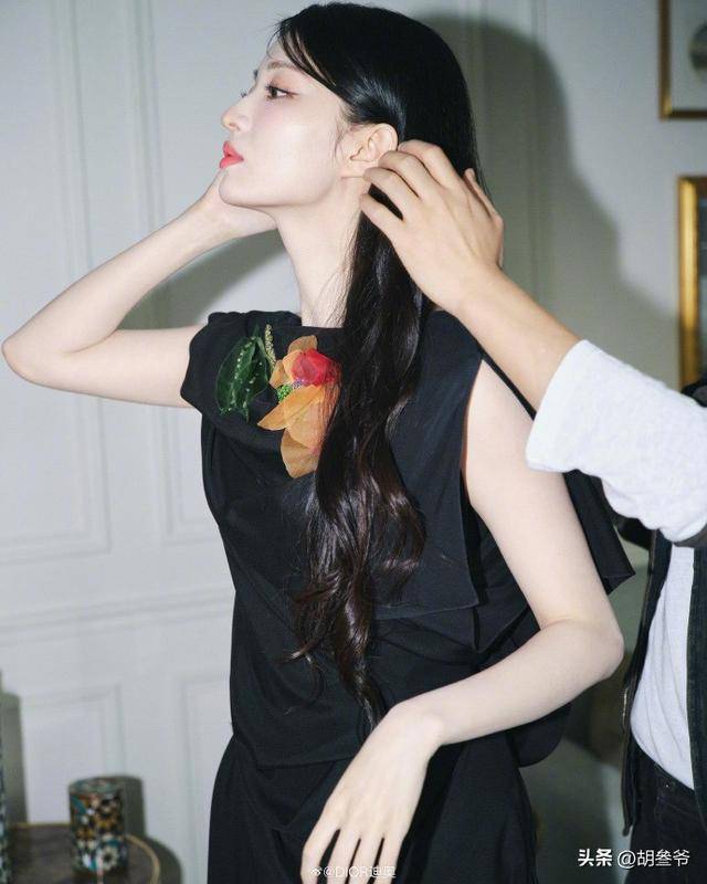 她穿的黑色蓬蓬微透视纱裙搭配复古盘发,甜美的长相配上优雅的造型,被粉丝喊作“迪奥公主”。