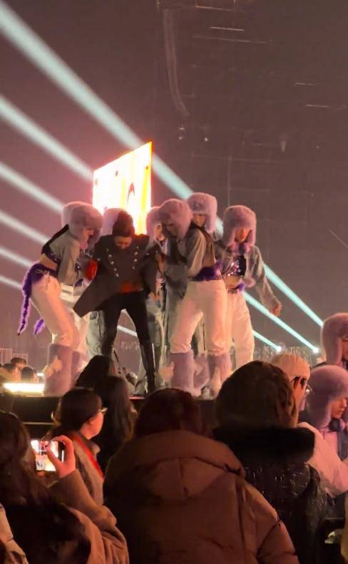 可就在她唱到高潮部分,跟着节奏走动的时候,脚下突然打滑,整个人失去平衡,直直地跪倒在舞台上。
