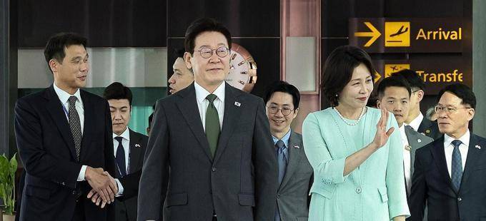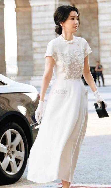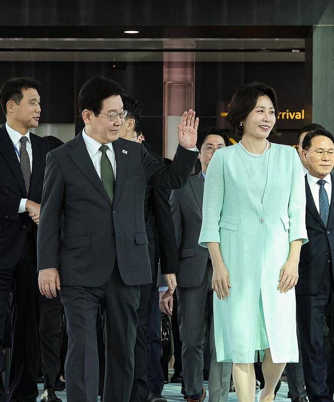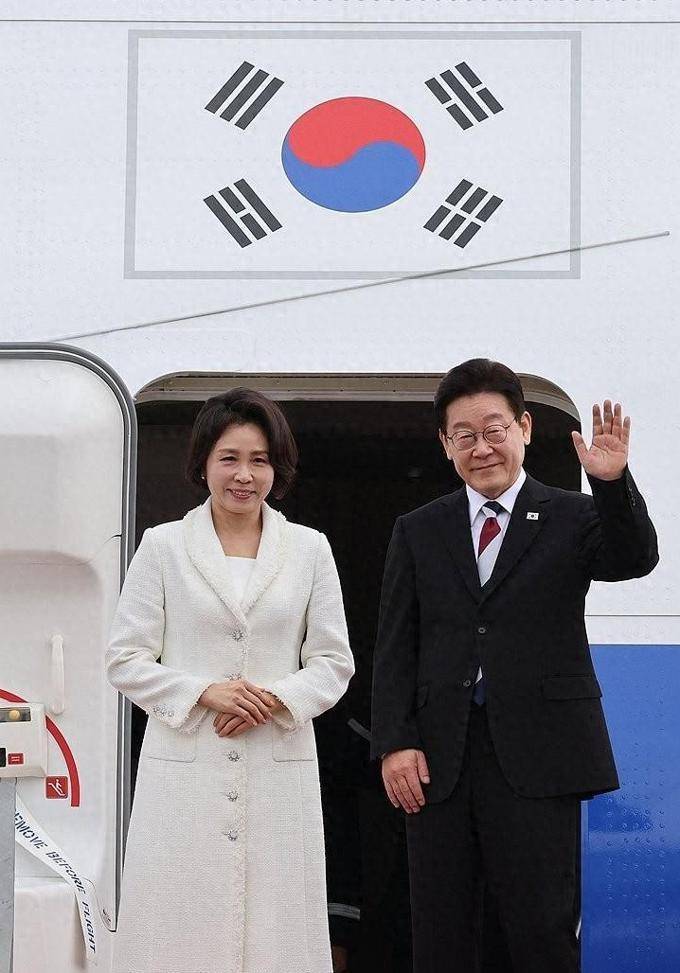 当总统李在明走出机舱时,他和他的妻子站在舷梯上。李在明向接机的员工挥手表示敬意,而金惠景则双手交叉放在小腹上,每一个动作都显得非常优雅。