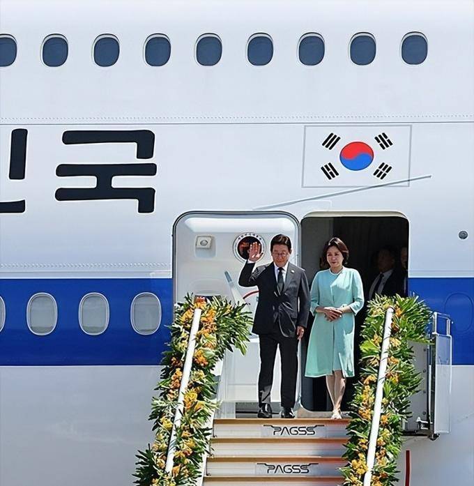 此次 抵达菲律宾 后,机场 举行盛大欢迎仪式,欢迎韩国第一夫人 伉俪光临。 红毯 铺展在场景中, 由舷梯两 旁扶手更 点缀以黄花绿植, 颇富菲律宾热带风情 与仪式感。