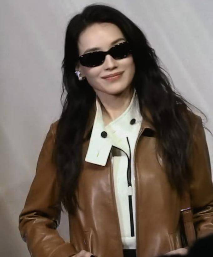 她那略显弯曲的发型与咖啡色的皮革外套相得益彰,既显得轻松又带有都市的氛围。