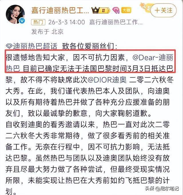 迪奥品牌方倒是第一时间做出了回应,全球公关总监发文表示对热巴缺席深感遗憾,明确是不可抗力导致的行程中断,还表达了对她安全的关切,甚至为赴巴黎的应援粉丝准备了心意礼物,品牌方的态度,反倒比艺人自己的团队更让人暖心。