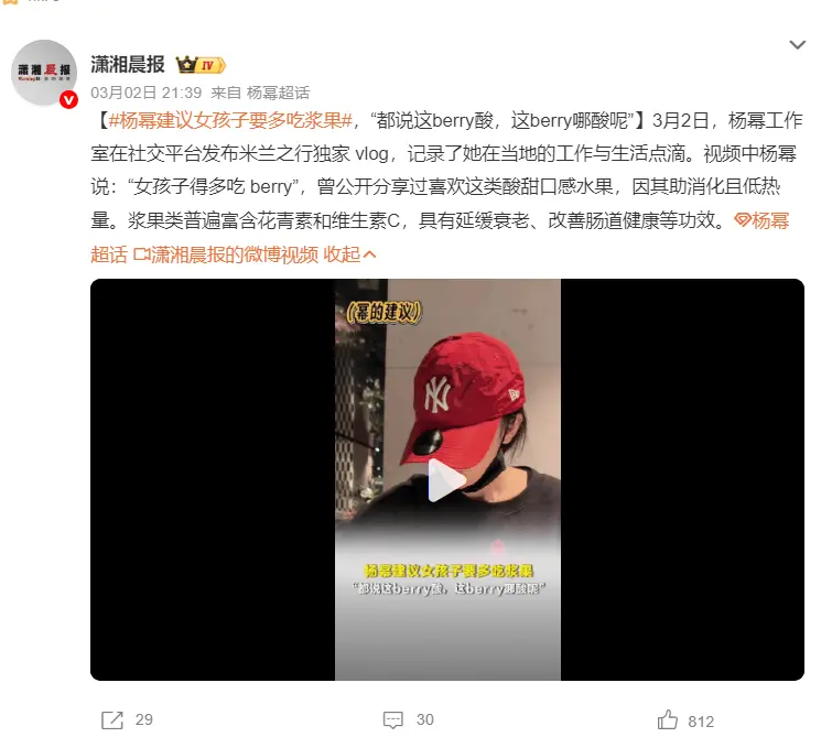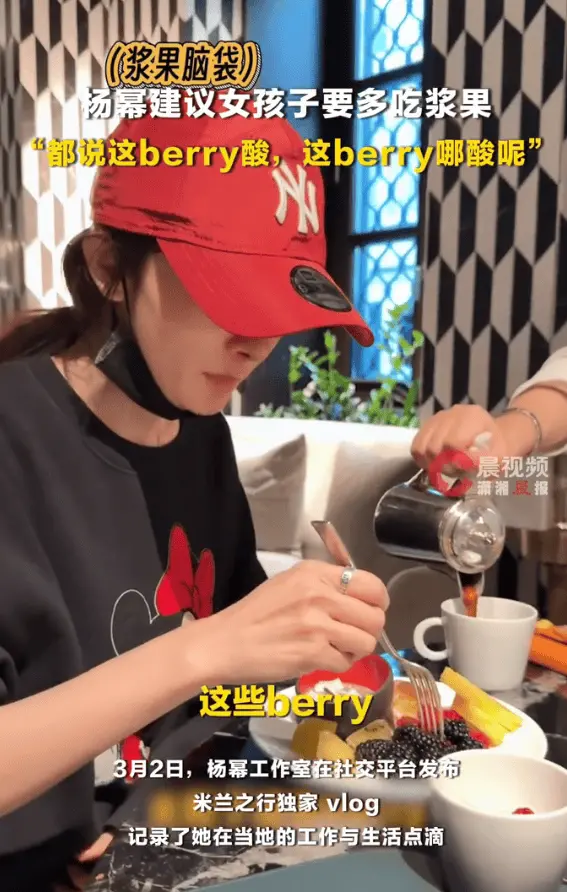 3月2日,杨幂工作室发布米兰之行独家vlog,记录她在当地的工作与生活点滴。视频中,杨幂分享道:“女孩子得多吃 berry”,并透露自己一直很喜欢这类酸甜口感的水果,因为既助消化又低热量,轻松又健康。