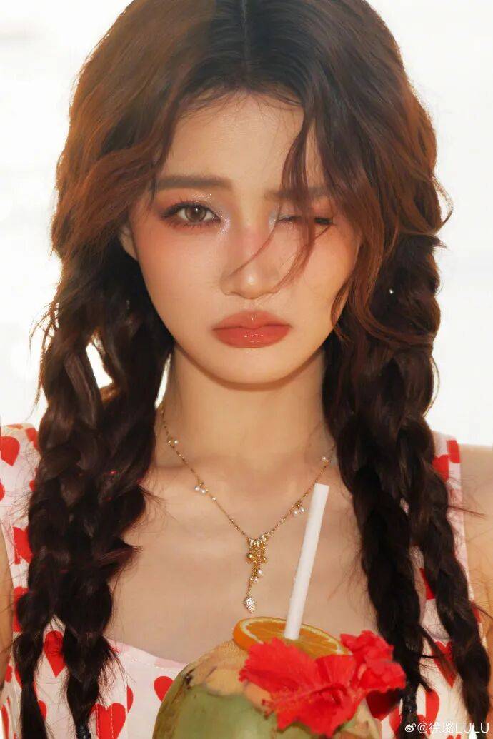 徐璐穿着花色比基尼泳衣,搭配花色短裙,她俏脸浓妆艳抹,浓眉大眼,烈焰红唇,染红的卷发飘逸,双手抱胸的样子,绝对性感撩人!