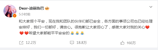 迪丽热巴在声明中明确表示:“现在我和团队的伙伴们都已安全,各方面的事项公司也已经处理安排好,我们一切都好。”