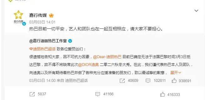 迪奥官方表态“安全重于商业活动”,强调不影响后续合作,各大品牌商业也恭喜迪丽热巴平安,她后援会在巴黎街头投屏致谢粉丝支持。