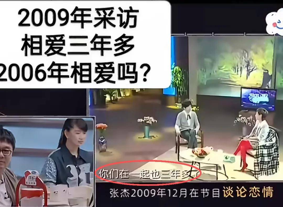 而在2009年,张杰录制李静节目时,李静直接说“你们在一起也三年多了”,又绕回了2006年。