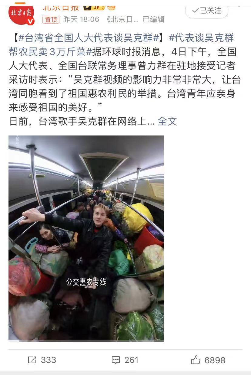 3月4日下午,全国人大代表、全国台联常务理事曾力群在驻地接受记者采访时表示:“吴克群视频的影响力非常非常大,让台湾同胞看到了祖国惠农利民的举措。台湾青年应亲身来感