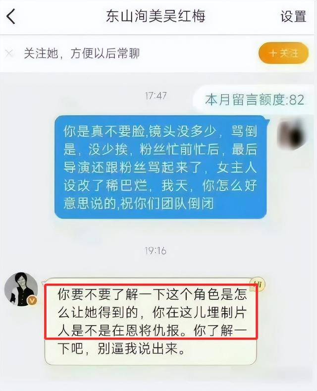 更过分的还在后面,吴红梅在回复粉丝私信的时候,直接说出了“你要不要了解下这个角色她是怎么得到的?别逼我说出来”这种话,还指责粉丝维权是恩将仇报。