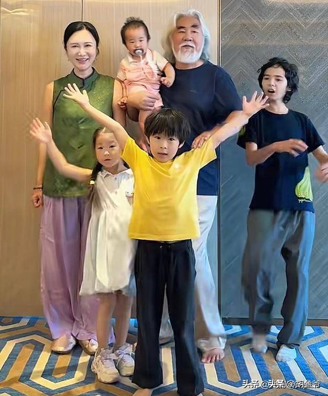 杜星霖站在一旁笑意盈盈,四个孩子围在身边,个个眉眼间都像极了张纪中。
