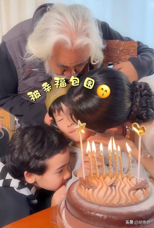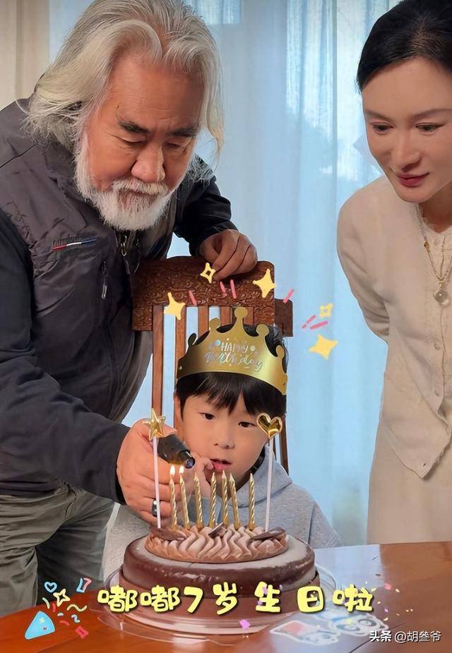 74岁的张纪中白发稀疏站在7岁儿子身边,和老婆杜星霖一起亲吻小寿星的画面看着格外温馨。