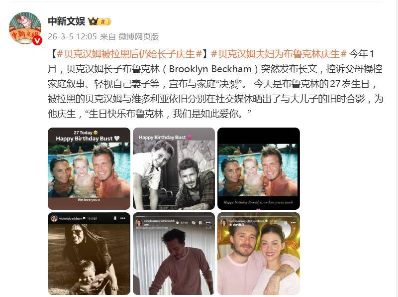 3月4日,贝克汉姆和维多利亚在社交媒体上同步发布长子布鲁克林的童年旧照,配文“生日快乐,我们爱你”,试图为儿子送上27岁生日祝福。然而,这温情一幕却因一个关键细节显得格外尴尬——他们根本无法@布鲁克林本人,因为这位寿星早已将全家人的社交账号统统拉黑。一场豪门家庭的“隔空喊话”,瞬间引爆了关于亲情边界与家族恩怨的舆论风暴。