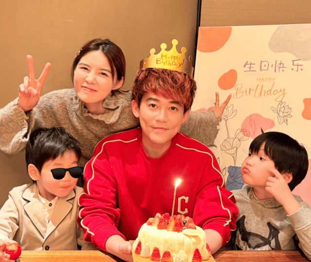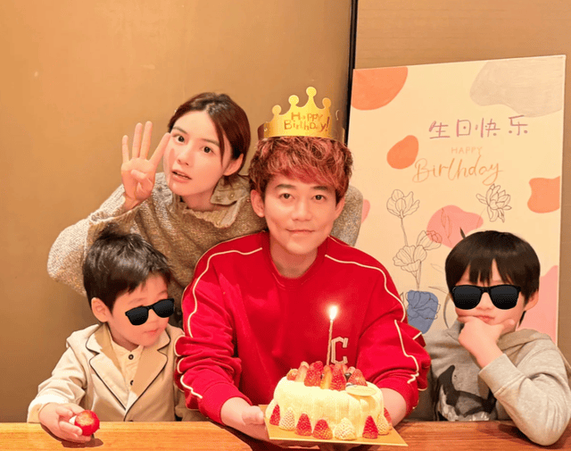 廖语辰先是晒出一家四口合照。照片中,廖语辰和两个儿子将身为寿星的苏醒环绕在中间,只见苏醒头戴金色“Happy Birthday”字样生日皇冠,身穿红色运动卫衣,面带温和微笑注视镜头,双手稳稳托着插有单支蜡烛的草莓奶油蛋糕,神情中透出被家人环绕的满足与幸福。