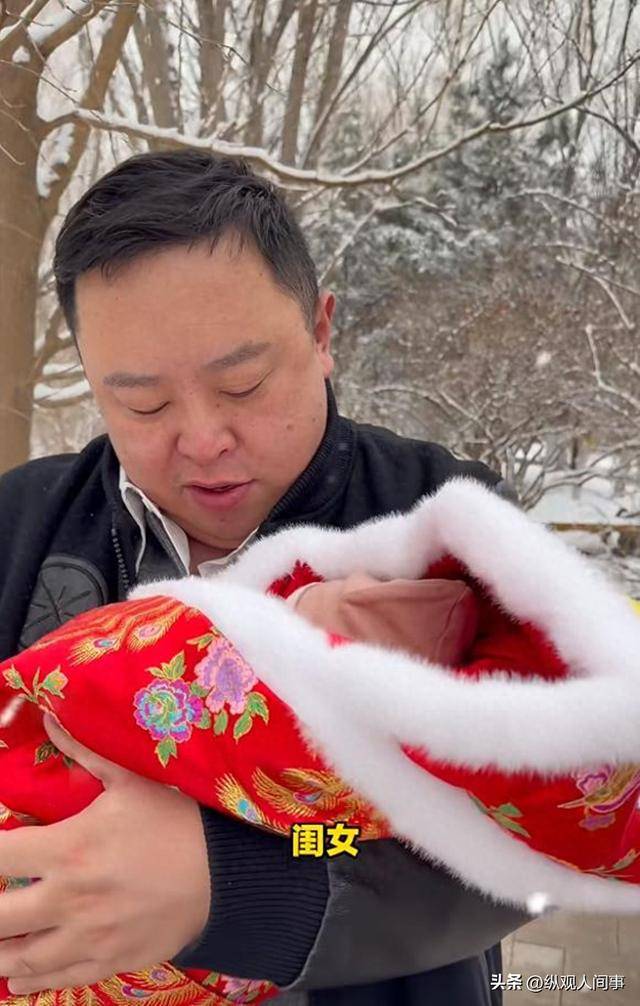 他的双手稳稳环抱着襁褓中的女儿,红色绣花襁褓边缘缀着柔软的白色绒毛,凤凰与花卉的刺绣图案在白雪映衬下格外喜庆,小小的婴儿被裹得严严实实。