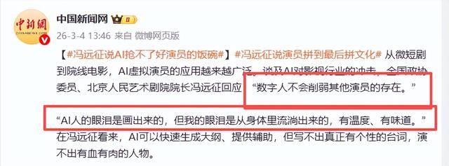 今年参加两会时,冯远征就专门劝青年演员多学习。他说 AI 之所以取代不了真人,核心原因是真人演员有 “温度”。