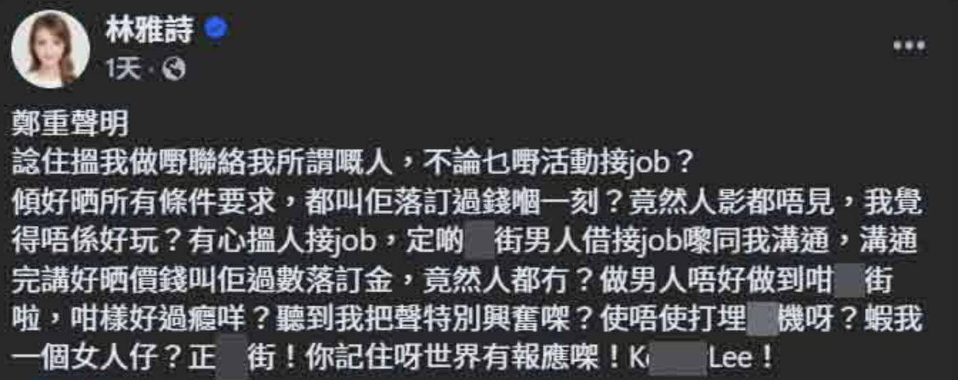 林雅诗在社交平台上发文称,有一名李姓男子与她联络洽谈工作,双方都已经谈好了所有细节,包括价格,没想到她在要求对方支付订金的时候,这名联络她的男子突然就消失了,之后再也没有上线。这件事令她相当愤怒,她认为对方根本就无心与她联络工作,只是借着洽谈工作与自己(语音)聊天而从中获得满足。由于这件事令她十分不悦,负面情绪爆棚,所以她只能选择在社交平台上宣泄自己的不满,直言对方欺负自己。