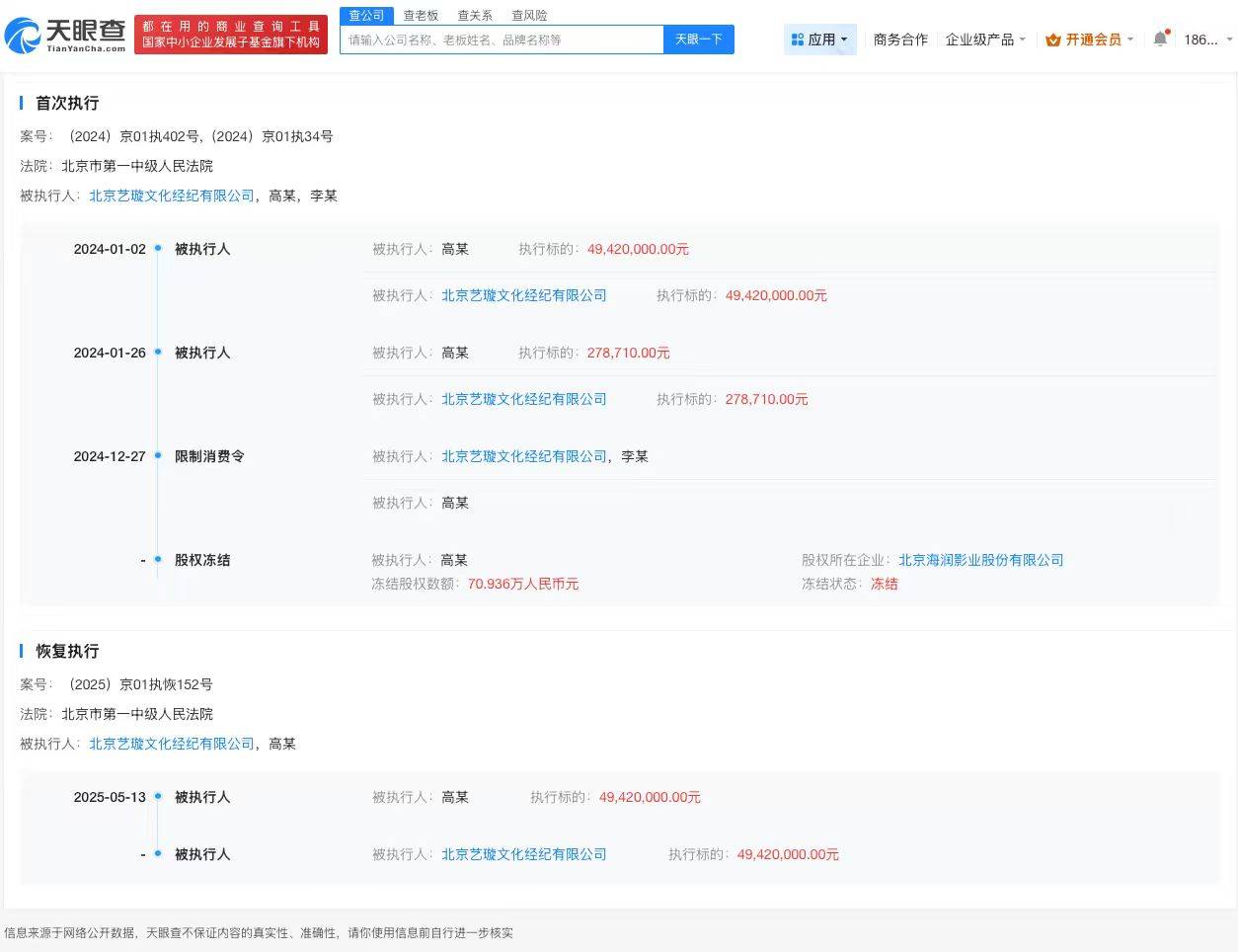 此外,董璇名下北京艺璇文化经纪有限公司现存一则恢复执行信息,执行标的4942万元,执行法院为北京市第一中级人民法院,涉及浙江唐德影视股份有限公司与北京艺璇文化经纪有限公司、高云翔相关演出合同纠纷案件。