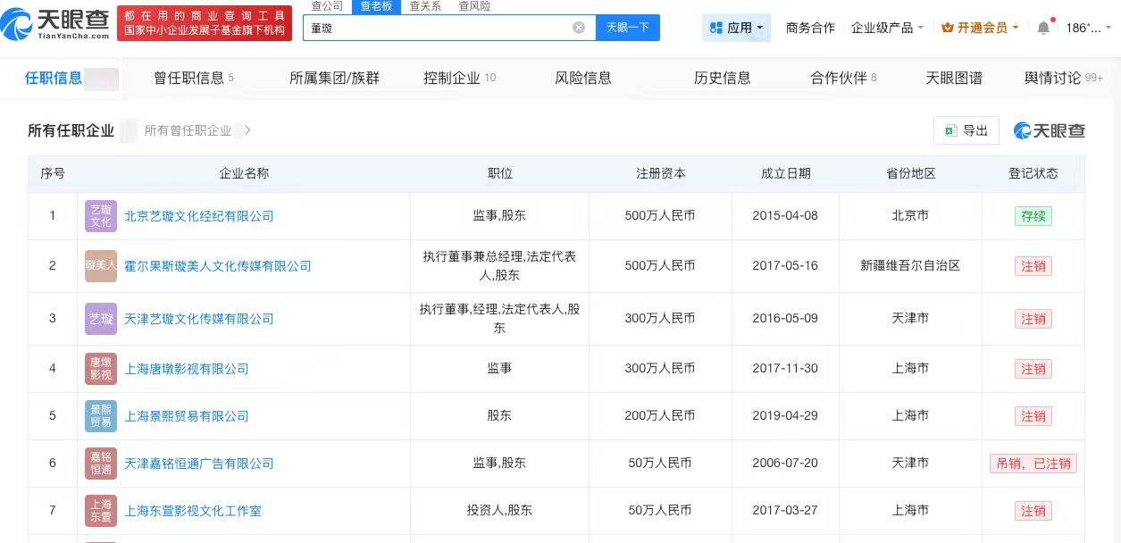 天眼查App显示,董璇名下关联12家企业,其中仅北京艺璇文化经纪有限公司处于存续状态,其他11家企业已注销或者吊销已注销。张维伊名下关联2家企业,其中仅上海某某某文化传媒有限公司处于存续状态。值得注意的是,董璇与张维伊无商业关联。
